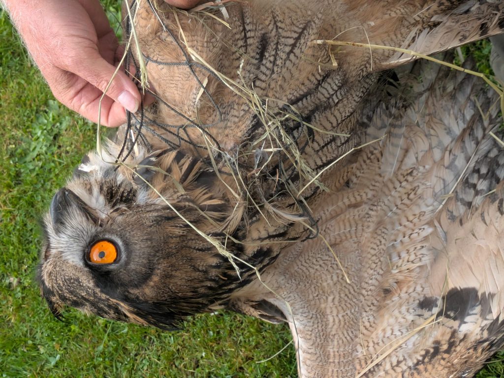 Vor Ort bot sich uns ein bedrückender Anblick – der majestätische Vogel hing unbeweglich im Netz, sein Blick wach, aber erschöpft. Wir waren zu dritt: die Anwohnerin, meine Frau und ich. Gemeinsam und mit viel Vorsicht begannen wir, das Netz Stück für Stück zu lösen. Jede Bewegung musste bedacht sein, um das Tier nicht noch mehr zu verletzen. Der Uhu blieb erstaunlich ruhig, fast so, als wüsste er, dass wir ihm helfen wollten. Schließlich war er frei.