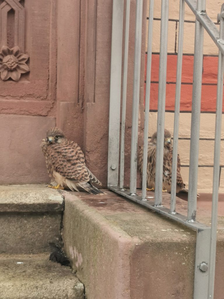 Es war ein Junitag im Jahr 2022, als mich ein Anruf erreichte: Zwei junge Turmfalken hatten ihren ersten Flugversuch gewagt – und waren unsanft auf dem Boden vor dem Kirchturm gelandet. Ihre Landung war mehr ein Sturz als ein Flug, und nun saßen sie dort, etwas benommen, aber unverletzt, mitten im Bereich, wo viele Menschen vorbeigingen.
